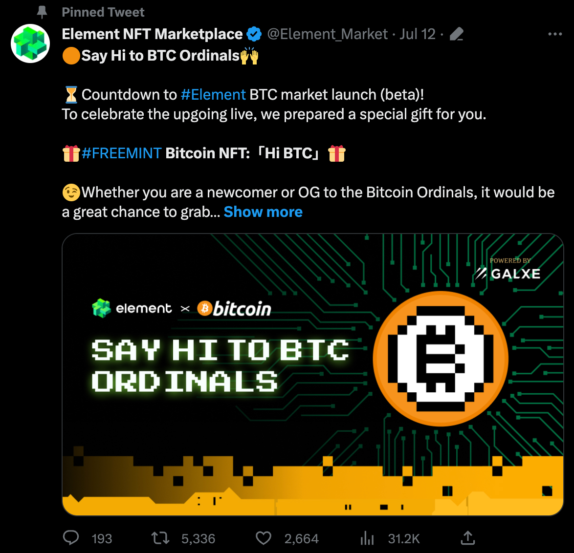 沈寂已久的 Element 宣布开放 BTC Ordiansl 市场内测