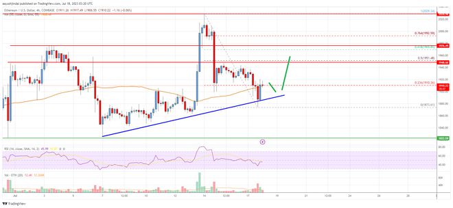 以太坊价格兑美元汇率在 1,850 美元上方盘整。如果 ETH/USD 突破 1,950 美元阻力区,可能会再次上涨。