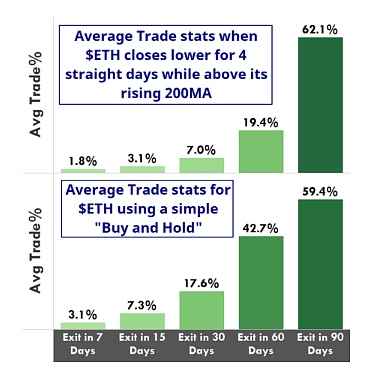 在 7 月 13 日收于令人印象深刻的数周高点并回到 2000 美元上方之后,以太币已连续四个交易日回调,这是我们将立即测试的条件之一。为了更好地为测试添加上下文,我们还将添加两个条件,要求 [1] 以太币高于其 200ma,并且 [2] 其 200ma 正在上涨。为什么?200ma 及其斜率都充当简单的过滤器来帮助确定市场状况。例如,以太币最近四天的回调发生在市场改善的情况下,其中以太币位于上涨的 200 日均线之上。如果当前的四天回调发生在下跌趋势的市场体系中,我们将要求 ETH 跌破其下跌的 200 日均线。