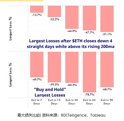 尽管平均贸易统计数据仍然很重要,但它并不总是能说明全部情况。在使用前面描述的相同条件比较两种方法的最大假设损失时,请注意,当前四天下跌设置的最大损失(即最差交易)远低于简单的“买入并持有”方法。这一最大的损失比较表明,虽然就平均交易而言,当前的设置可能无法击败“买入并持有”,但以太坊目前的风险敞口可能低于平常——这是大多数经验丰富的交易者都会欣赏的。