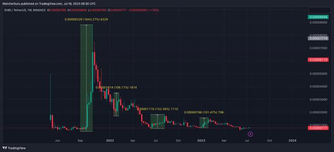 为了了解所需上涨的幅度,让我们分析一下 SHIB 之前的一些上涨趋势。自 2022 年以来,SHIB 只注意到其价格出现显着上涨的三个阶段。在所有情况下,资产的涨幅约为 100% 至 150%。好吧,这些价格走势都是宏观熊市期间的缓解性反弹。然而,在看涨的情况下,SHIB 的反弹力度更大。在 2021 年 9 月至 10 月的上涨期间,该资产倾斜超过 1,600%。