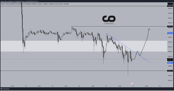 检查比特币的 30 分钟技术图表,可以看到蜡烛图收盘价高于上述蓝色下降趋势线是必要的。如果 BTC 价格能够维持烛台收盘于蓝线上方,则可能会向 30,400 美元的水平移动。