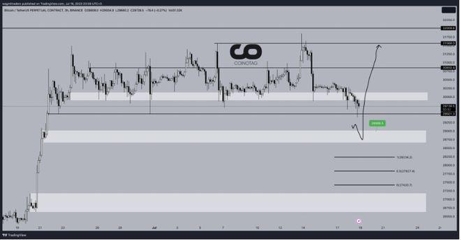 然而,如果烛台收盘价不继续高于蓝线,则下行趋势可能会持续并跌破 29,500 美元。
