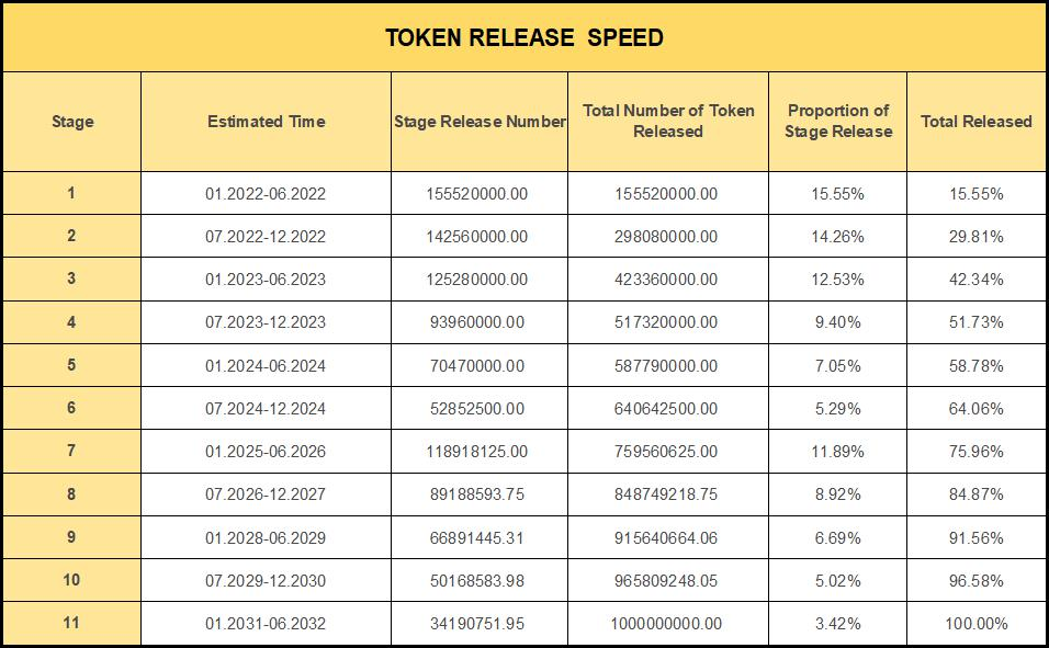 DMC会根据上表中的释放规则线性释放。由第一阶段的每小时释放36000 DMC开始逐渐释放,每小时释放量随着时间周期不断降低。以6个月为一阶段,直至第11阶段全部释放完成。