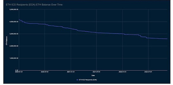 另外一个有趣的数据是,据区块链分析平台Nansen 分析,自2020 年以来参与以太坊ICO 的巨鲸钱包余额就持续下降,到去年底为止,从411 万颗下降到259 万颗,共下降了64%。