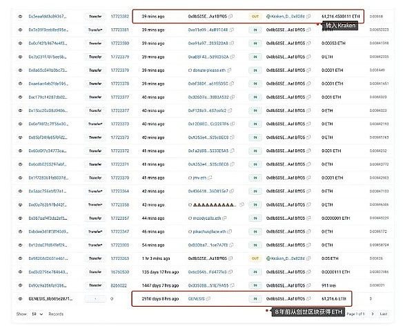 根据推特上一位分析师余烬今日推文,已有近8 年(2,910天)未有动静的一个以太坊创世ICO 巨鲸(0x8b5)在昨日将61,216 颗ETH 转入交易所Kraken,市值约高达1.16 亿美元。