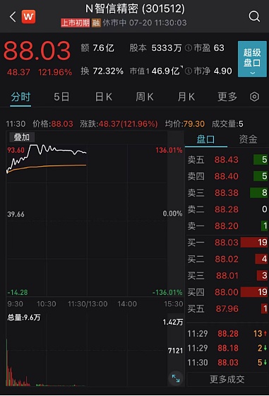 7月20日上午,N智信上涨121.96%,盘中最高涨至93.60元。若参照盘中最高价,相比发行价,中一签可赚26970元。