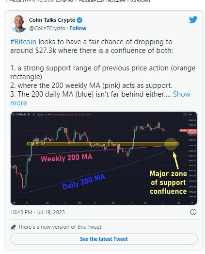 正如加密货币市场评论员 Colin Talks Crypto 指出的那样,BTC/USD 的下一个主要支撑位直到 27,500 美元附近才会出现。该水平不仅是基于先前价格走势的支撑,而且 200 周移动平均线 (MA) 和 200 日移动平均线都已开始在其下方收敛。
