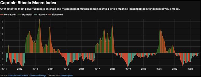 Capriole 比特币宏观指数是 40 个比特币基本变量的聚合衡量指标,包括链上、宏观经济和股市指标。所有因素都已合并到一个机器学习模型中。