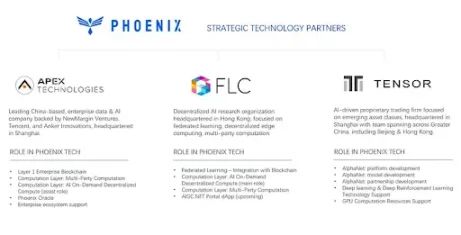 Phoenix 的 L2 计算层基础设施的主要特点是 AI 模型计算服务、多方计算(MPC)和去中心化的 AI 流程。这些项目的目标是将人工智能驱动的功能引入区块链应用程序,并将 Web3 功能引入链下人工智能应用程序。Phoenix 计划在数据和人工智能驱动的 Web3 领域实现范式转变,并已规划出一些开发路线。截至目前,Phoenix 公布额战略技术合作伙伴包括:
