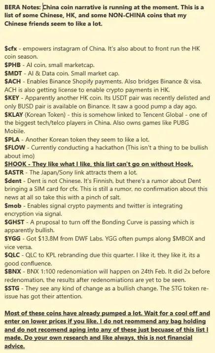 「这是国产概念币叙事的代币清单。有些是国产团队的项目,有些并不是,只是国内的朋友们似乎很喜欢」。