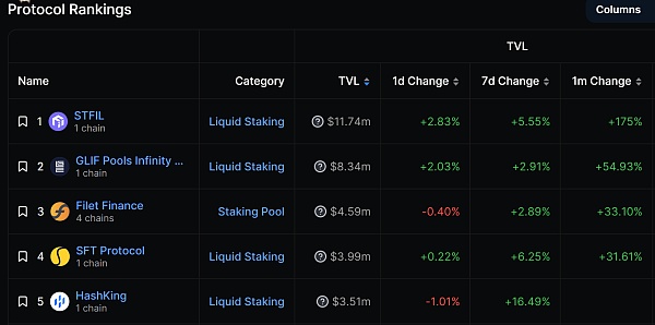 首先,HashKing采用去中心化模式,合约开源,用户可以通过查看代码来了解产品逻辑;其次,HashKing加入了NodeDAO这个引领着DAO和DeFi 2.0发展的项目,这让HashKing变得更加透明和公平。我们可以在DefiLlama收录的FIL质押TVL排行中看到, HashKing目前排名第五,在流动性质押类目中排名第四。但更值得关注的是,HashKing上7日的TVL增长亮眼,位居同赛道的第一位。