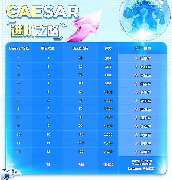 用户每12小时可以通过消耗Sui代币“喂养”Caesar,以提升向Caesar 喂食的等级和算力,每次花费10 Sui。 向Caesar 喂食的进阶包括 12 个级别,总共需要 108 次喂食才能达到巅峰级别。