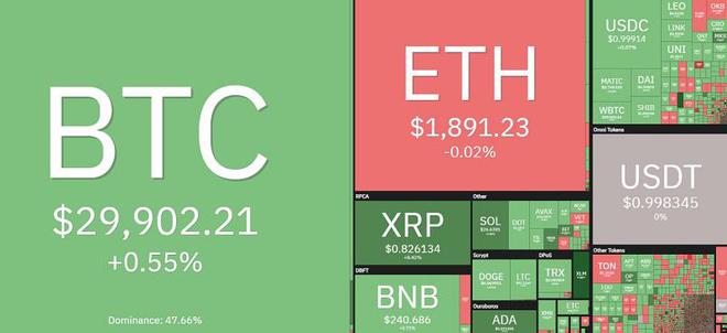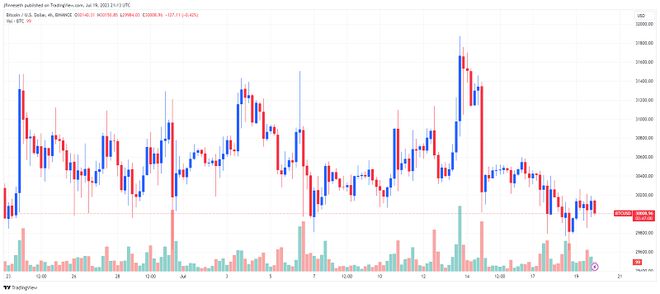 TradingView的数据显示,比特币(BTC)的交易价格在29,855美元至30,264美元之间的窄幅区间内,在交易员等待下一个市场动向的过程中,多空双方都未能占上风。