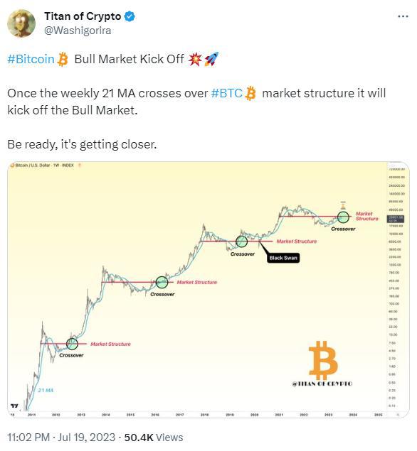 一旦这条向上倾斜的趋势线突破了当前的现货价格区间,就会出现一段较长的上涨期,这使得21周移动平均线获得了绰号,即“牛市线”。Titan of Crypto将这种现象称为“牛市的开始”。