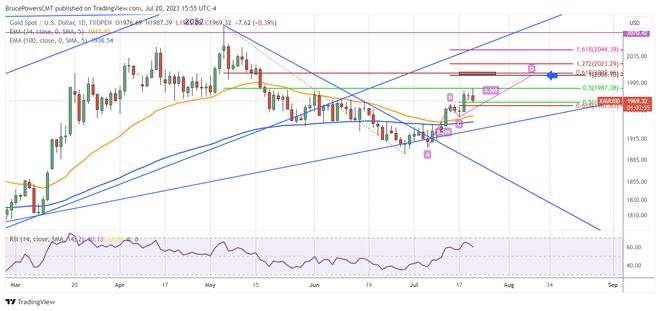 FXEmpire分析师Bruce Powers指出,黄金上涨至新的趋势高点1987美元,然后遇到阻力使其回落。该高点完成了对先前下跌趋势,自历史高点2082美元的50%回撤。它还超过了6月2日以来的前期波动高点1983美元,但幅度不大。黄金在日内出现了震荡,随后跌破了昨天的低点1970美元,完成了上次小幅上涨的50%回撤。