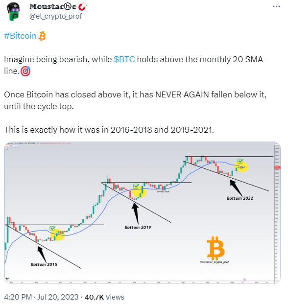 “想象一下看跌,而比特币保持在每月20 SMA线之上,”Mustache评论道。“一旦比特币收市高于该水平,它就不会再跌破该水平,直到周期顶部。2016-2018年和2019-2021年的情况正是如此。”