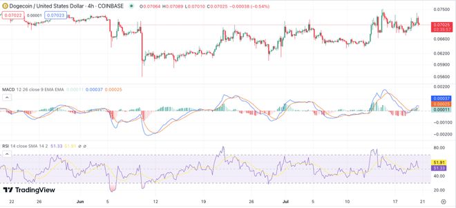 4 小时狗狗币价格分析也显示出看涨迹象,尽管价格在交易时段开始时向下突破,但价格已达到 0.07077 美元的水平。前几个小时价格持续上涨,但目前价格正在回补上涨走势。