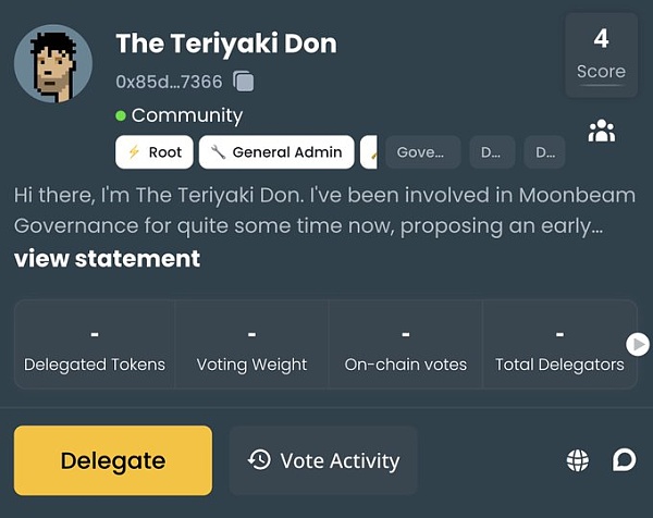 Teriyaki Don是深度参与Moonbeam治理的OG,同时也是GLMR持有者大户,先前还提出了Moonbeam Grant加速计划的早期版本。从他发布的推特内容和Proposal提案不难发现,Teriyaki Don是一位真诚可爱又认真的社区KOL。用户经常会在Twitter或Moonbeam论坛上看到Teriyaki Don讨论DeFi、稳定币并尝试协助发展Moonbeam和波卡生态系统。