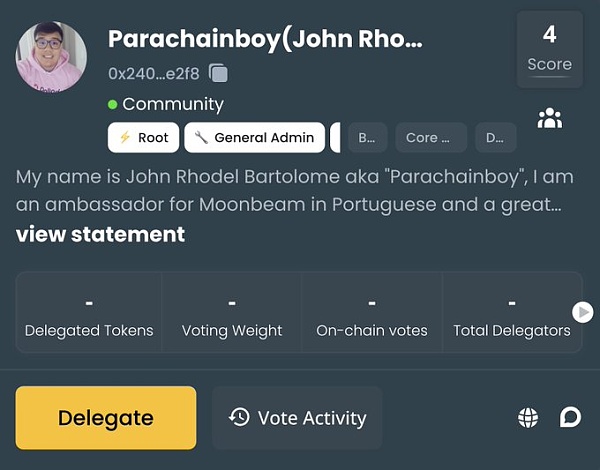 John Rhodel Bartolome,又名“Parachainboy”,是Moonbeam的葡萄牙语大使,也是Moonbeam生态的狂热爱好者。John希望通过有组织的方式分析和辩论提案来帮助社区,还可以通过协助代表团来帮助Token持有者和葡语爱好者深入认识Moonbeam。