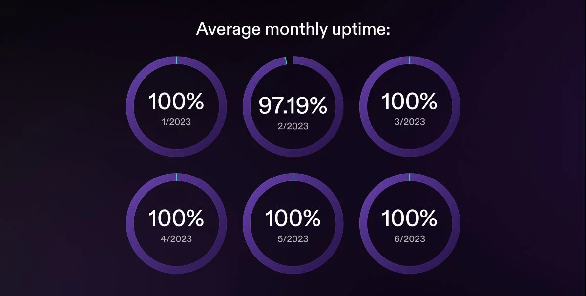 我们快照了网络的每月正常运行时间,以过去 6 个月中给定月份的正常运行时间百分比来衡量。