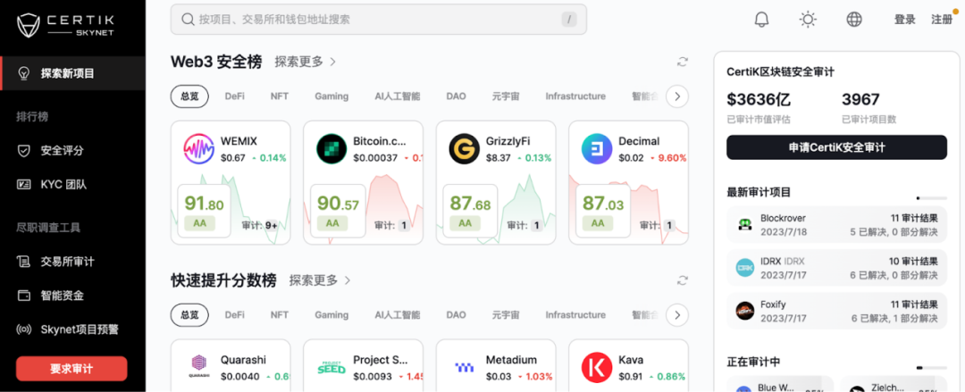顾荣辉:Skynet for Community平台是希望为圈内用户,打开名为「安全」的大门。从前「安全」二字对于普通用户来说是一个不可触及的领域,但攻击和损失却是确确实实的。未来用户不仅可以通过这个平台,查看所有他们关注的生态系统和项目的市场状态,还可以通过CertiK排行榜查看其安全评分和风险,获知第一时间的预警和威胁动态。除此之外,用户还可以查看项目的团队背景检测,我们的KYC版块会赋予徽章给那些通过KYC检测的项目,用户即可借此大幅度降低陷入Rug Pull等欺诈骗局的风险。