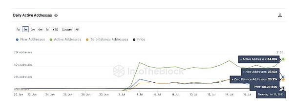 根据区块链分析公司IntoTheBlock的数据,狗狗币社区的新地址和活跃地址数量均有所增加。特别是在 SEC 和 Ripple 案件判决之后,活跃用户大幅增加,推动了消息推动的价格上涨。