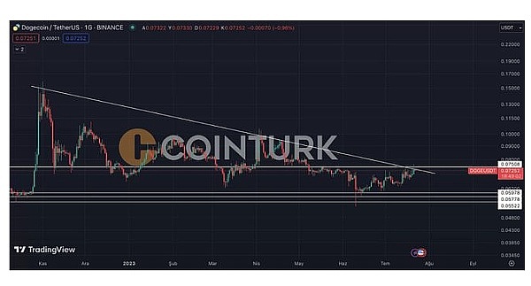 尽管进展良好,但当我们查看DOGE/ USDT 货币对的日线图时,我们发现 7 月 21 日以 10% 涨幅突破的 0.075 美分阻力位在每日收盘时无法维持在该水平之上。因此,价格下跌的可能性变得更加明显,第一支撑位在0.066美分,第二支撑位在0.059美分。如果出现相反方向的走势,狗狗币需要超越的第一个阻力位是 0.077 美分的水平,该水平在 7 月 21 日尚未被突破。该阻力位后面是 0.081 美分和 0.094 美分。