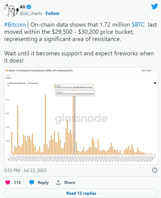 近 172 万 BTC 最后转移的价格范围为 29,500 美元至 30,200 美元,这可能是一个强大的阻力。