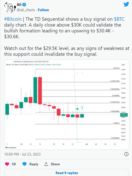 该分析师进一步报告称,根据 TD Sequential 指标,BTC 的日线图显示出买入信号。如果每日收盘价超过 30,000 美元,则可能会确认看涨模式,从而可能上涨至 30,400 美元至 30,600 美元的范围。