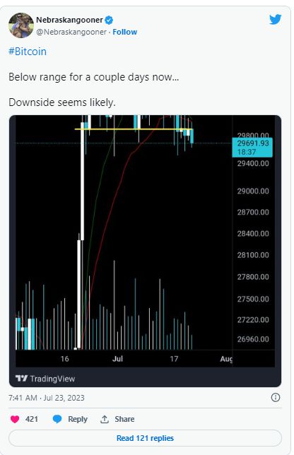 交易员兼分析师 Nebraskan Gooner 承认 BTC 价格走势“似乎有可能”下跌,并指出 BTC/USD 已跌破过去一个月的狭窄区间。
