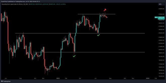 受欢迎的交易员 Crypto Tony在对 3 天图表的最新分析中警告关注者:“目前 BTC 已经出现双顶拒绝,因此我们需要真正记下价格水平,以防下跌。”