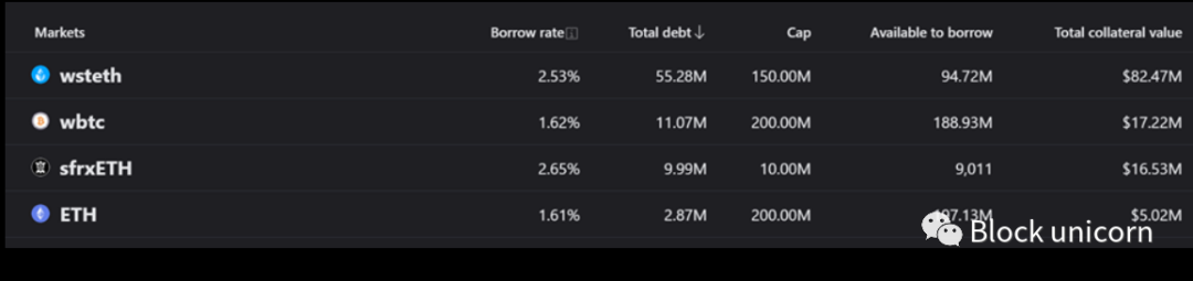 总的来说,这些资产已经有超过 1.2 亿美元被存入作为抵押,但其中超过 80% 来自于列表中的两个 LSD(wstETH 和 sfrxETH)。