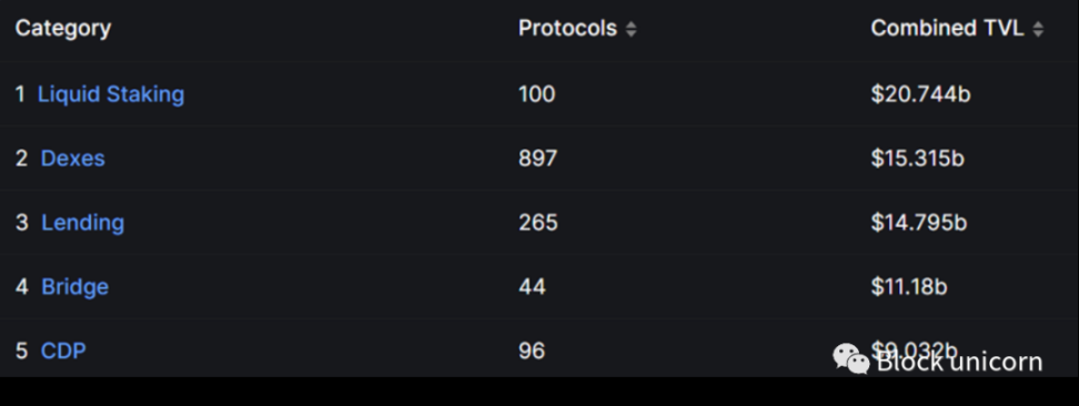 放眼看去,我们可以看到 LSD 实际上已经成为 DeFi 中所有 TVL 的最大来源: