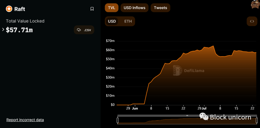 与前两个协议相比,相比于其他的协议,Raft 和它的稳定币 R 并没有被广泛地讨论和关注,但到目前为止,它们仍然取得了令人印象深刻的进展。在几周内,Raft 的 TVL 从 100 万美元增加到 5500-6000 万美元,当前数据是 5770 万美元。