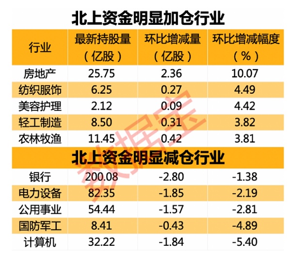 分行业来看,北上资金加仓多个轻工业板块,房地产、纺织服饰、美容护理、轻工制造、农林牧渔、商贸零售行业持股量环比增幅居前,科技属性板块遭北上资金减持。
