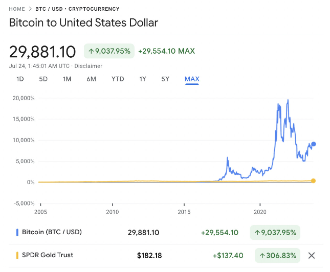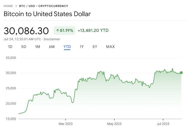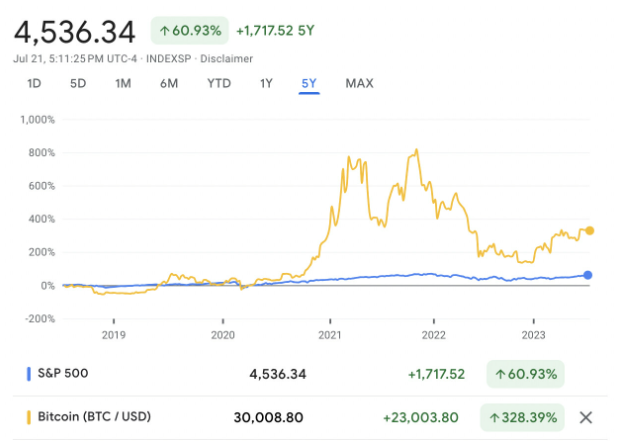 2023 年前 7 个月,标准普尔 500 指数上涨了 18%。同期,比特币的价值增长了 80% 以上。一年内,标准普尔 500 指数上涨了 14%,而比特币上涨了 32% 以上。