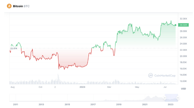 在提出问题时还应该考虑历史价格走势——我应该购买比特币吗?简而言之,自 2009 年比特币推出以来,它仍然是市场上表现最好的资产类别之一。CoinMarketCap 数据显示,2011 年,比特币交易价格为 0.061 美元。这意味着仅 100 美元的投资就可以产生 1,639 个 BTC 代币。