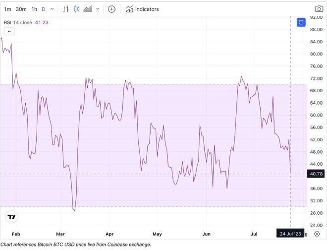 根据相对强度指数数据,比特币价格回调可能很快就会停止。经过一周多的横向价格波动,比特币正在接近超卖区域。如下图所示,比特币每日RSI目前为 41。这意味着它现在更接近超卖大关 30,而不是 70 超买区域。