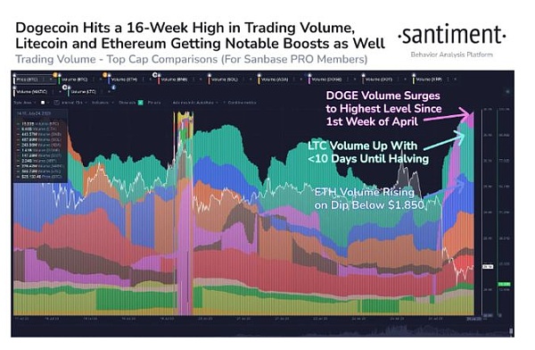 根据链上数据提供商 Santiment 的数据,狗狗币交易量已触及 16 周新高。今天狗狗币价格突然上涨后,许多交易者对其表现出了兴趣。随着 8 月 2 日减半事件的临近,莱特币也受到了越来越多的关注。也要关注以太坊。