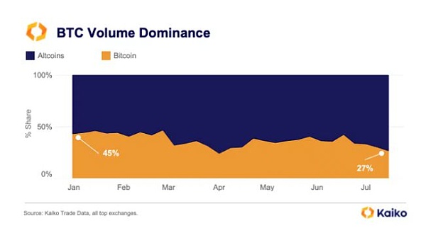 2023 年 7 月尤其属于山寨币,因为 Ripple-SEC 诉讼的裁决以及比特币的整合。根据 Kaiko 的数据,在山寨币领域的反弹中,7 月份比特币的交易量主导地位下降了 8%。另一方面,像狗狗币(DOGE)这样的山寨币最近备受关注。