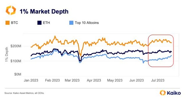 山寨币流动性指的是购买或出售这些替代加密货币的难易程度,自 7 月初以来略有增加。该数据来自Kaiko的市场深度,该深度查看所有中心化交易所中资产的出价和要价,从而全面了解该资产的流动性。