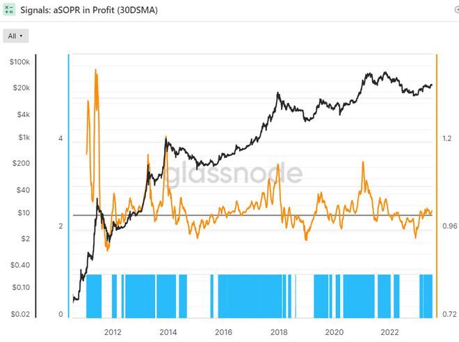 与此同时,比特币调整后支出产出利润率(aSOPR)指标的 30 天 SMA 也高于 1,该指标反映了所有链上移动代币的实现损益程度。