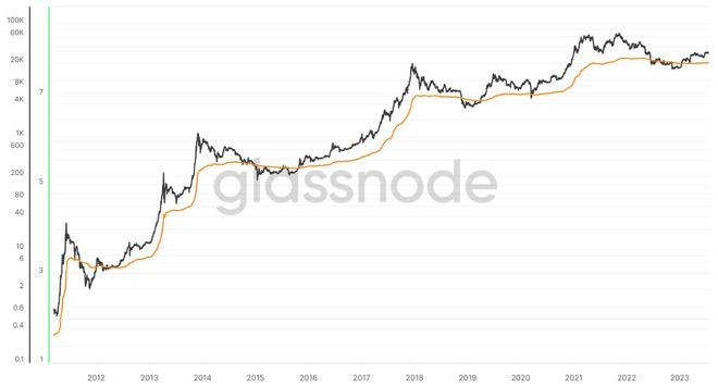 大约在比特币突破 200DMA 的同时,它也突破了其实际价格,即每种 BTC 币最后一次变动时的平均 BTC 价格(投资者为其比特币支付的平均价格的代理)。