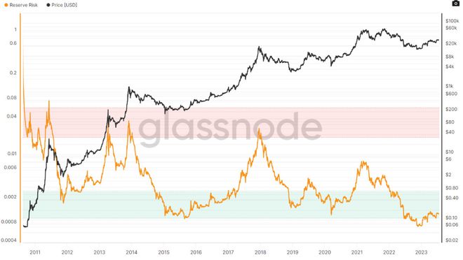 根据 Glassnode 的说法,储备风险“用于评估长期持有者相对于任何给定时间点的原生代币价格的信心”。储备风险是“一种长期周期性振荡指标,对当前价格(出售激励)与长期投资者的信念(不出售的机会成本)之间的比率进行建模”。