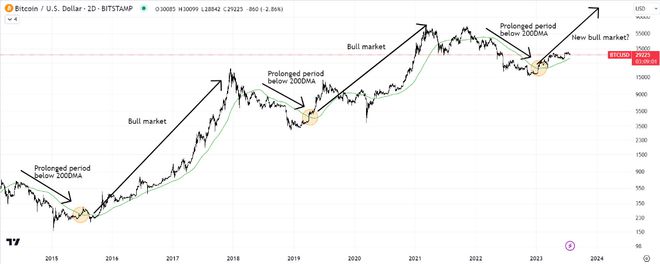 当比特币在长期低于 200 日移动平均线之后重新突破 200 日移动平均线时(就像 1 月份的情况一样),这在历史上发生在新牛市周期的早期阶段,并且从历史上看是一个非常好的长期买入信号。
