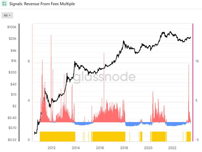 Glassnode 的费用倍数收入在几周前飙升,使其 2 年 Z 得分高于 0,这表明对区块空间的需求正在加速。