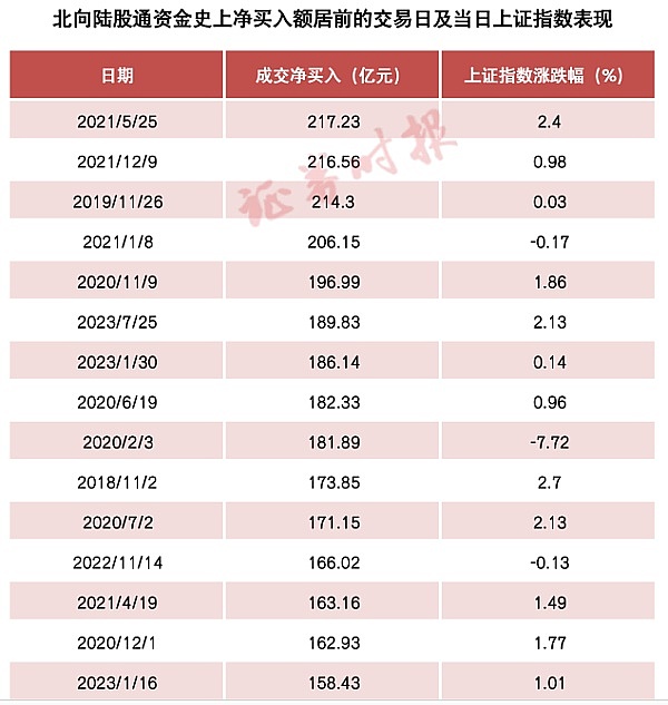 在此之前,年内陆股通资金净买入额最高的是2023年1月30日的186亿元。另据统计,史上北向资金日净买入规模超过今天的情形只有5次,其中有三次都出现在2021年。