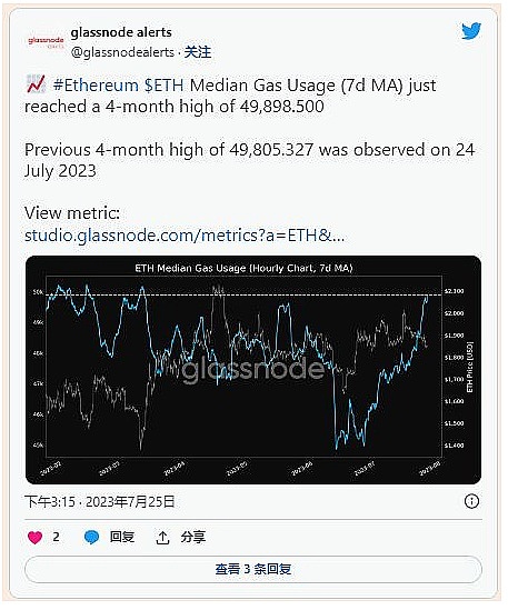 Glassnode 的最新数据显示,以太坊的 Gas 使用量中位数目前处于四个月高位。当网络需求增加时,我们通常会看到更高的天然气费,通常是随着价格上涨。这是否意味着需求正在恢复?