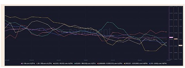 根据 ETH 的供应分布指标,持有 100,000 至 100 万 ETH 的地址在 7 月 21 日至 23 日之间趋于平稳,随后出现了枢轴。截至发稿时,该类别(以黄色表示)控制着 ETH 流通供应量的 15.26%。